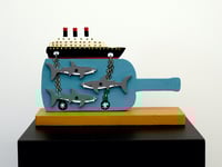 Acrylic, house paint, hardware, and wood on salvaged wood.
